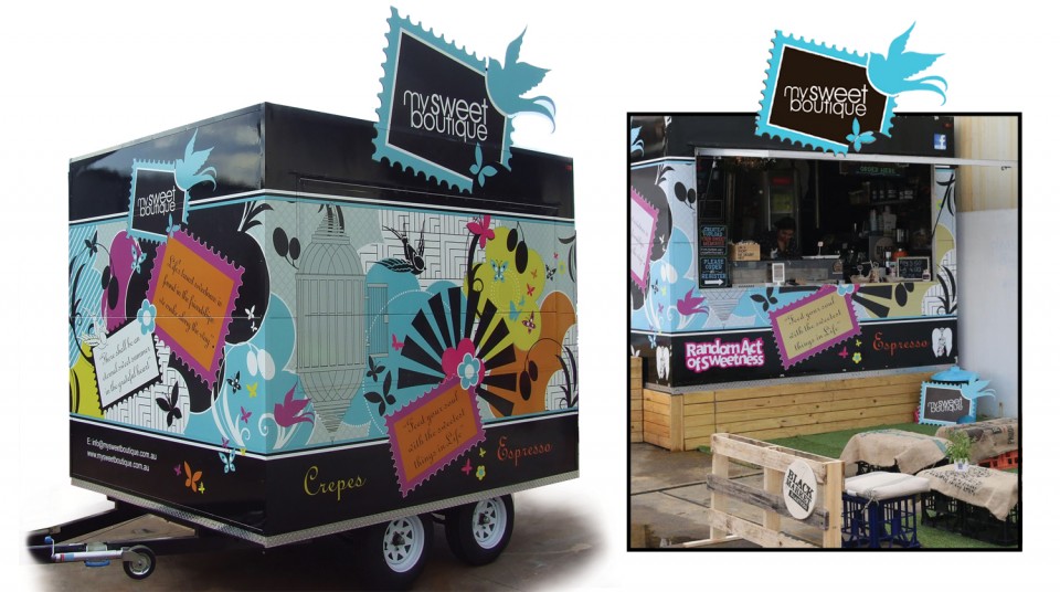 Winner 'Silver' for cart Design at Sydney Royal Easter Show. This unique design has been created to captured much personal meaning and connection for our client - statement 'Hope . Imagine . Believe. My Sweet Boutique serves freshly baked desserts from crepes and waffles to an assortment of espresso coffees and boutique teas. Design, Print and Install.